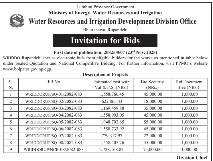 बोलपत्र र सिलबन्दी दरभाउपत्र आह्वानको सूचना