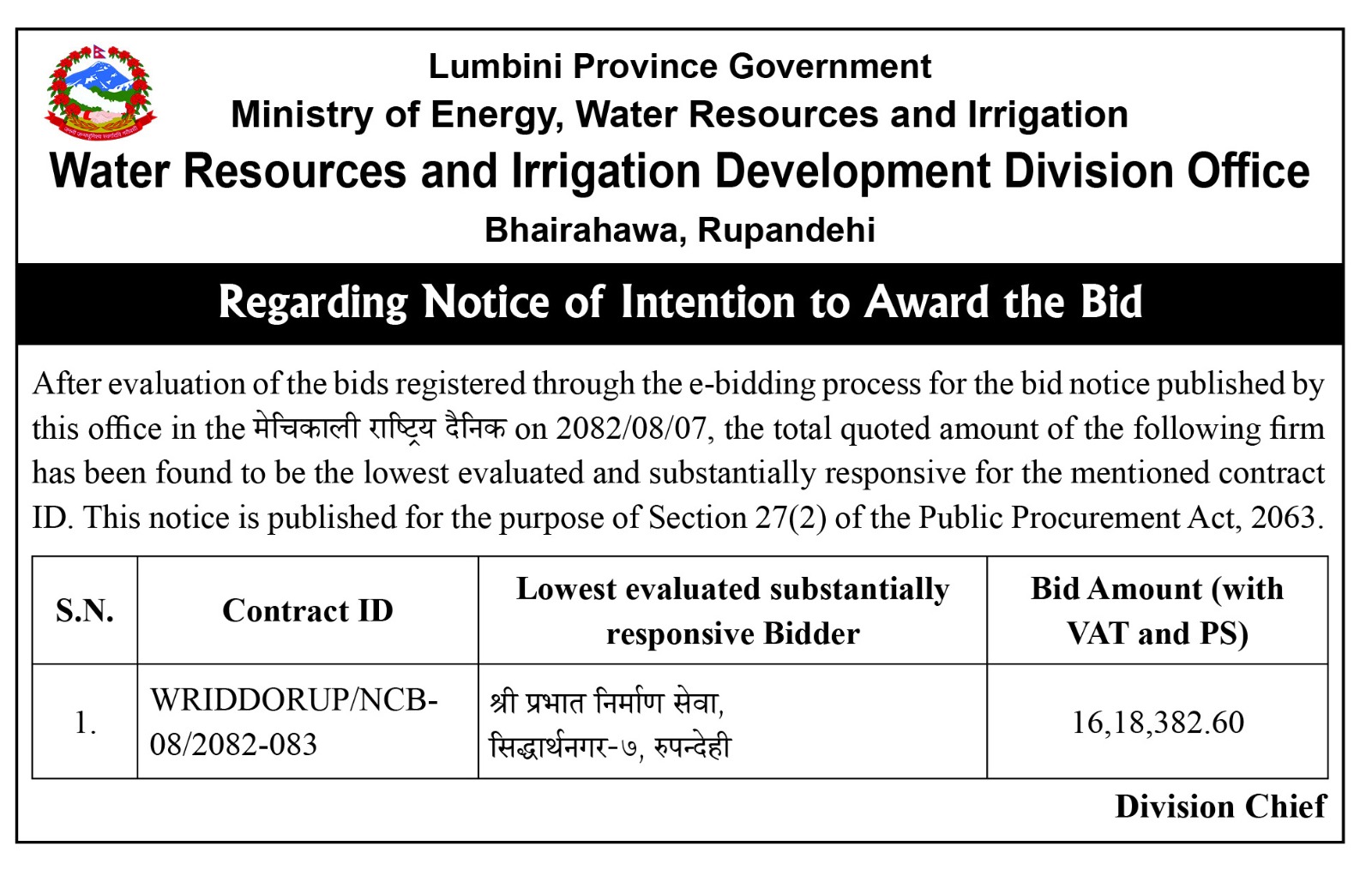बोलपत्र स्वीकृत गर्ने आशयको सूचना