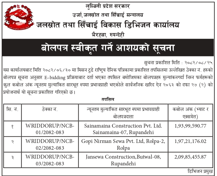 बोलपत्र स्वीकृत गर्ने आशयको सूचना